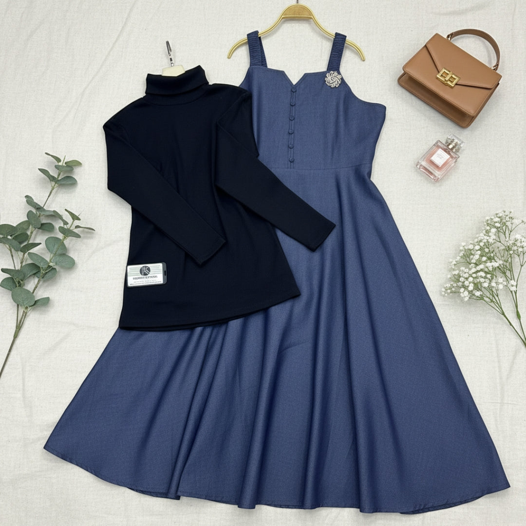 Stylish denim maxi paired with a chic high-neck overlay. Perfect for a standout look with a blend of sophistication and comfort.