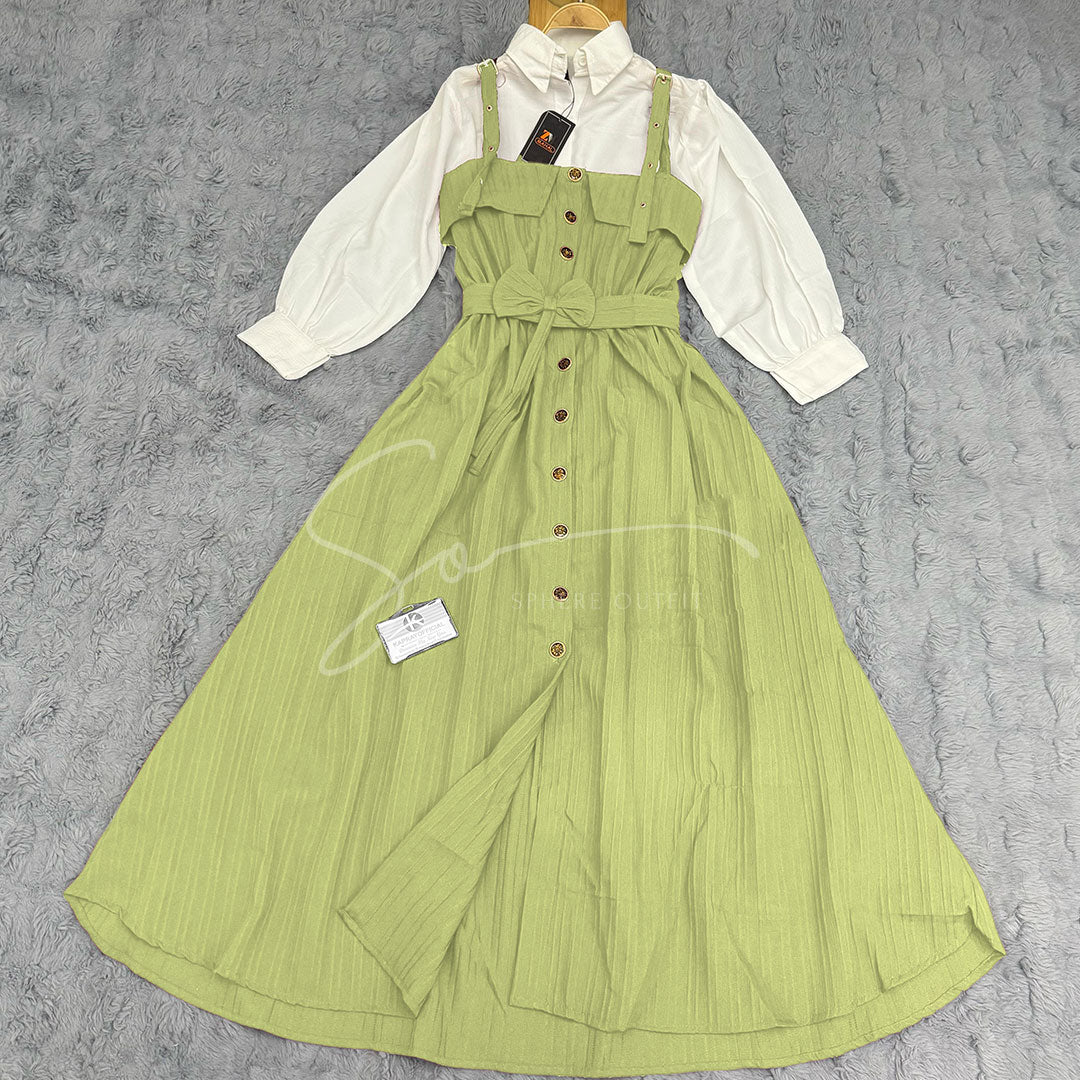 - Style: Two-piece set with separate white shirt and full-front overall dress